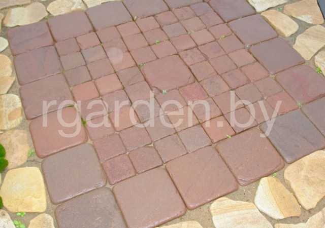 Одним из главных преимуществ брусчатки перед обычным рваным песчаником является возможность укладывать ее различными узорами, волнами, тем самым добиваясь неповторимости и подчеркивая свою индивидуальность.