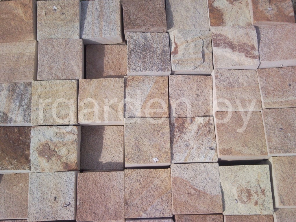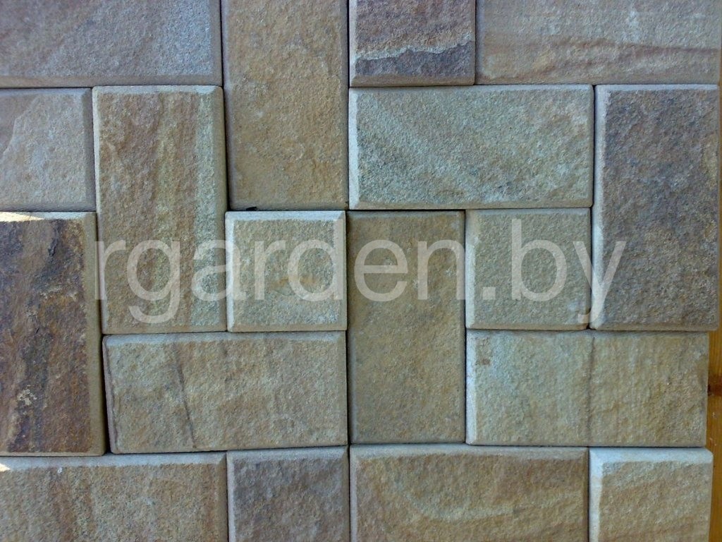 Производится вручную на камнерезных станках из песчаника «Желтый» и представляет собой плитку правильной формы, с гладкими спиленными краями с четырех сторон. Одним из главных преимуществ брусчатки перед обычным рваным песчаником является возможность укладывать ее различными узорами, волнами, тем самым добиваясь неповторимости и подчеркивая свою индивидуальность.