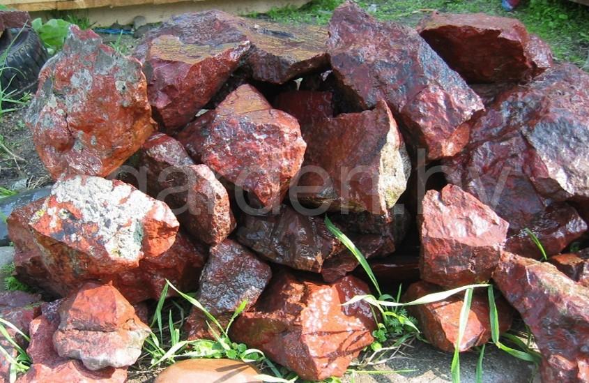 Размер бутового камня варьируется от 10 до 30 см в длину, 10-20см в ширину и от 6 до 25см в высоту. Бутовый камень Яшма красная можно купить как оптом от 1 тонны, так и поштучно.