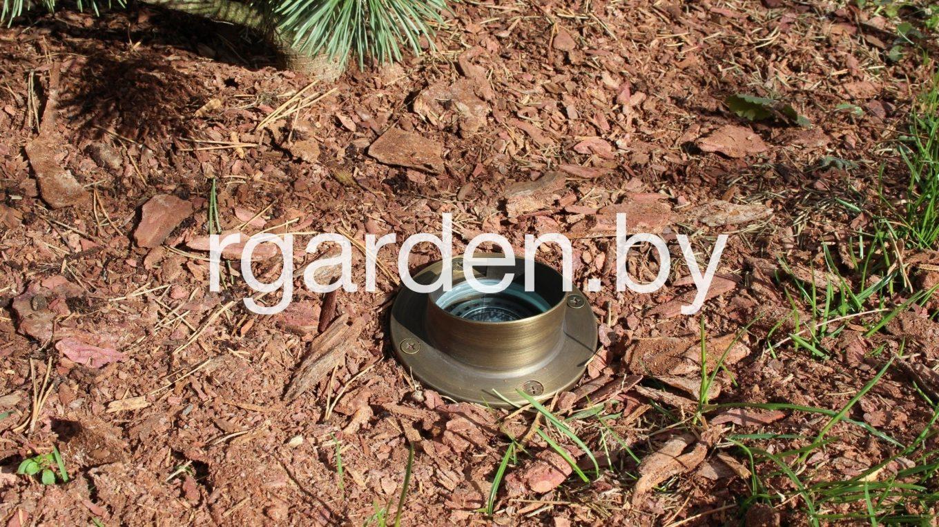 Закапываемый уличный ландшафтный низковольтный светильник, 12В, латунный корпус с козырьком от ослепления, цоколь под лампу MR16, IP65, длина кабеля 7,5м.