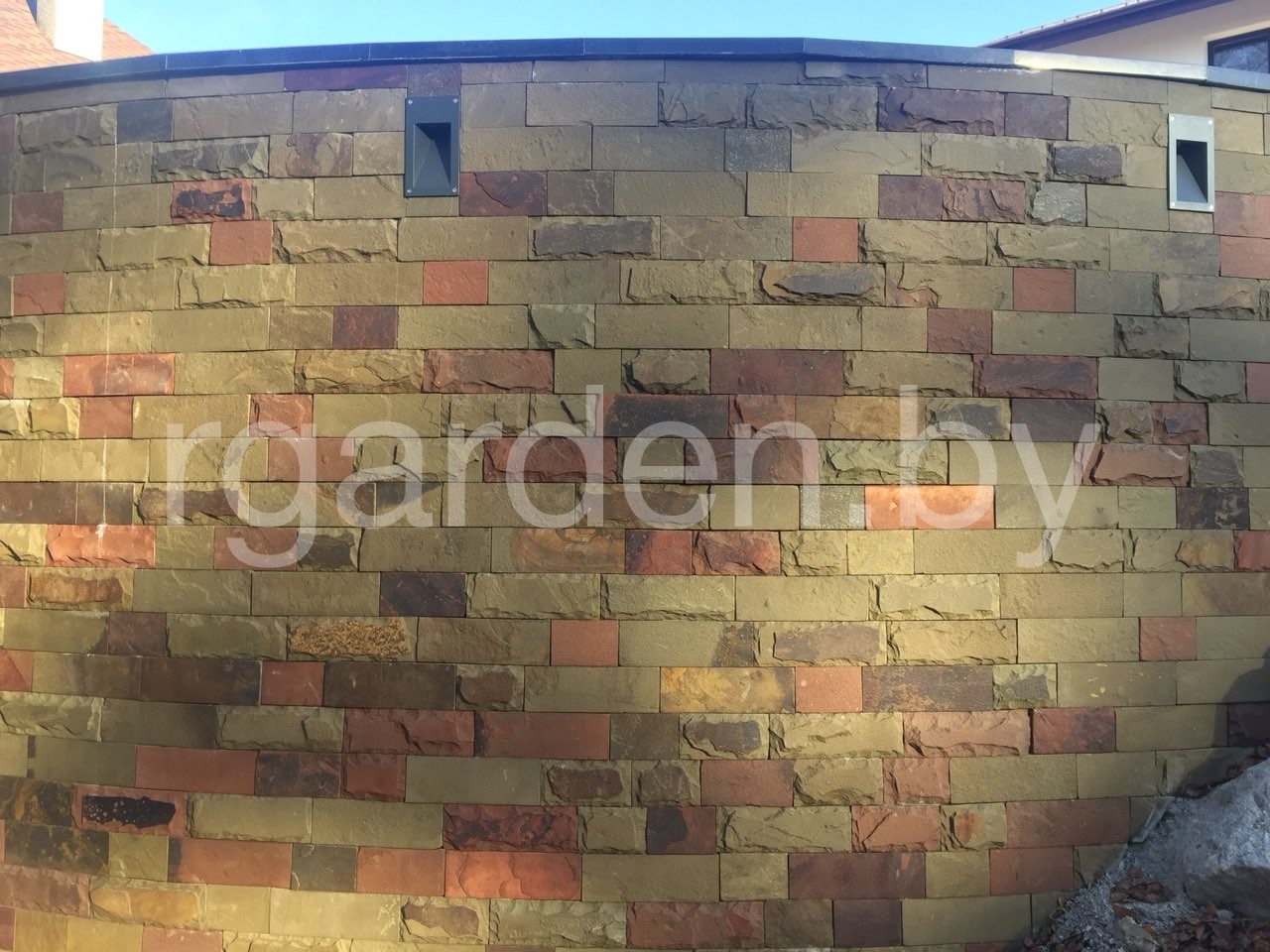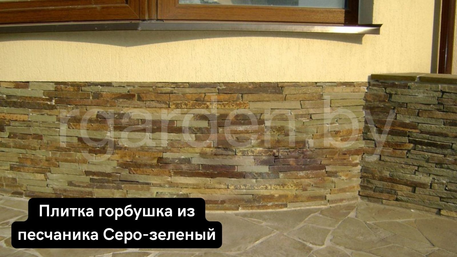 Плитка может быть в виде прямоугольников с ровными пилеными краями высотой 5см либо10см и произвольной длины. Либо в форме Горбушки (Лапши). Такая плитка получается в результате обпила природного камня песчаник серо-зеленый на полоски разной длины с одним неровным рваным краем, толщина зависит от толщины заготовки и находится в пределах от 2 до 5 см.