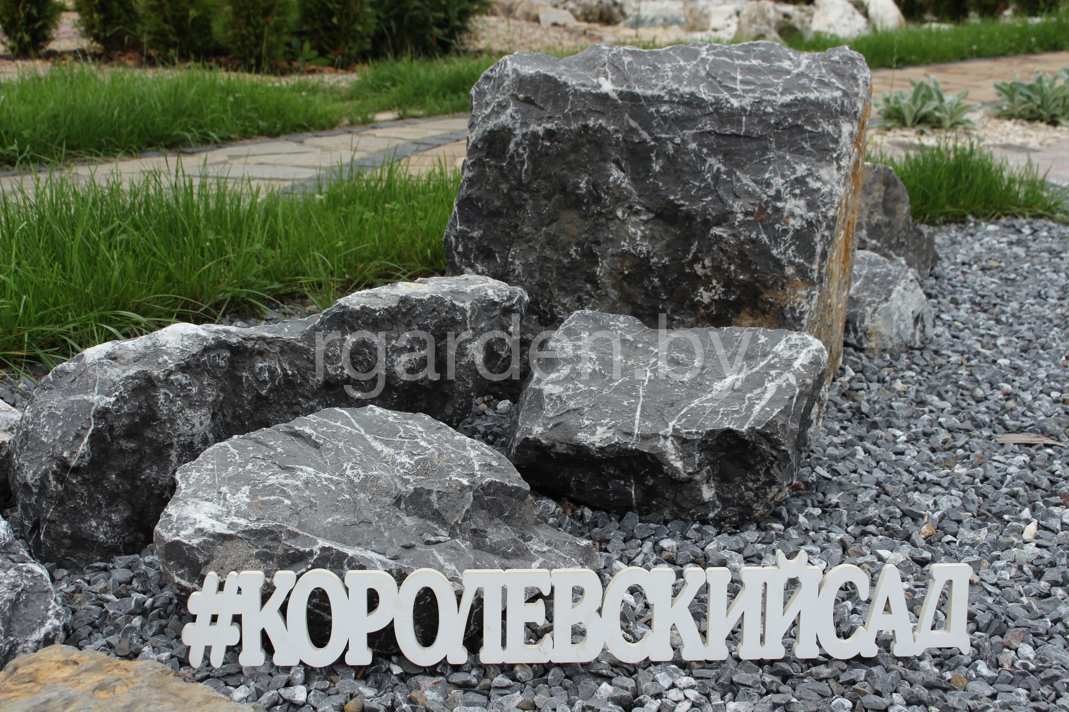 Валун Черный – это натуральный камень в виде кусков горной породы неправильной формы темно-серого цвета с белыми кварцевыми прожилками.